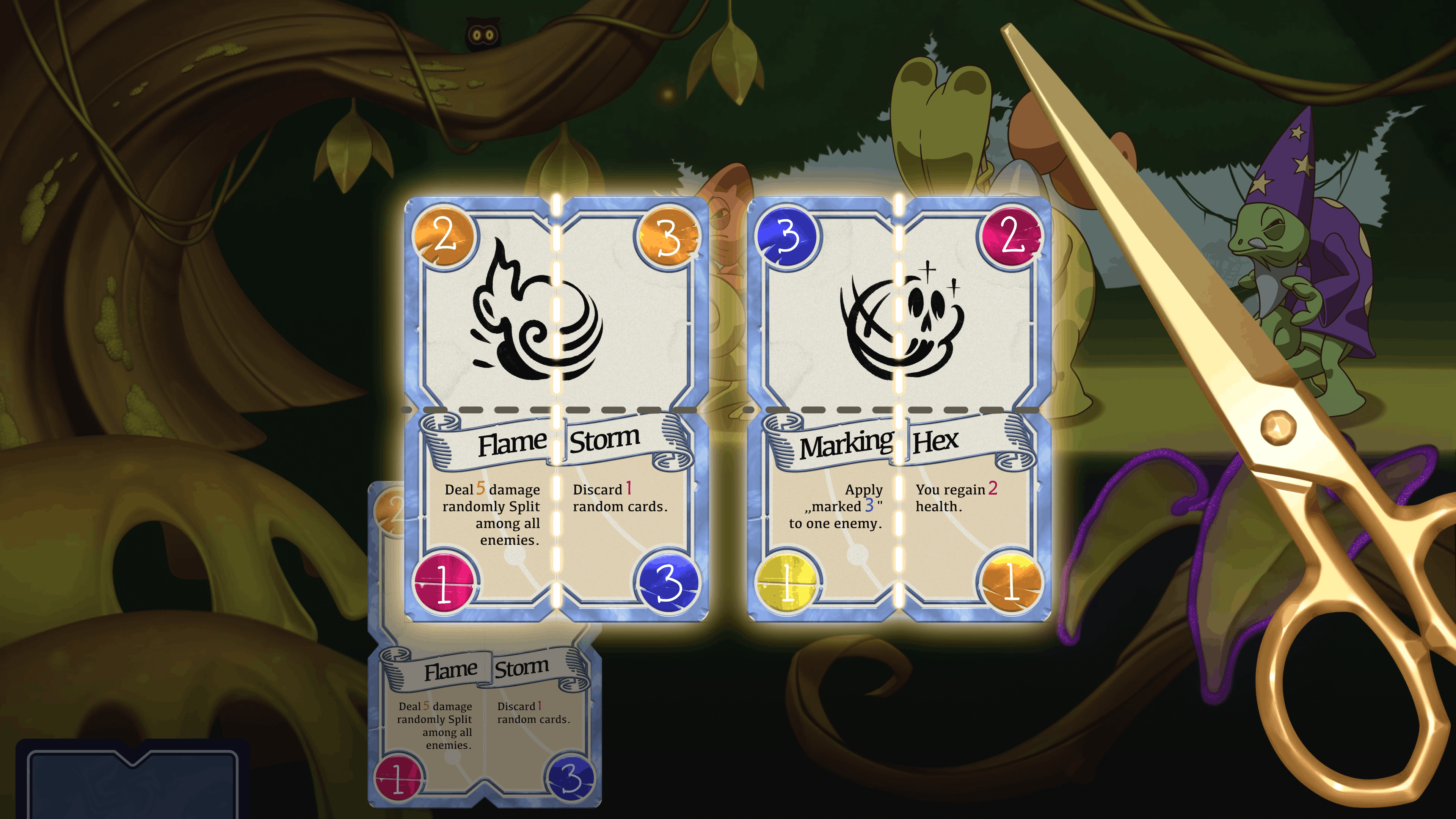 Cardwork is a rogue-like deck-building game centered on cutting up playing cards to create powerful new combinations. Two cards are cut vertically or horizontally and then taped back together, turning destruction into creation. By combining different card halves and their unique abilities, players build powerful new cards while fighting enemies in a paper-crafted world. Inspired by classic card games and cartoon aesthetics, the game dares players to break every collector’s rule to survive and win.